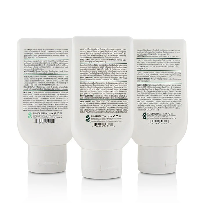 - Three 88ml bottles: White Knight Gentle Daily Facial Cleanser, LiquidSand Exfoliating Facial Cleanser, Combination Code Face Moisturizer.