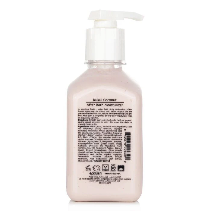 Epicuren After Bath Moisturizer is a weightless, fragrant after-bath body moisturizer. The Kukui Coconut formula uses exotic oils and rich natural emollients to hydrate, soothe, and protect dry skin.